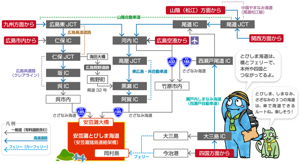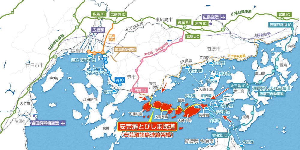 安芸灘とびしま海道へは、広島市内方面からは広島呉道路(クレアライン)経由で、九州・関西・山陰からお越しの山陽自動車道からは高屋ジャンクションで東広島・呉道路経由で、竹原市方面からは国道185号線さざなみ海道経由で、四国(愛媛・今治)及び、瀬戸内しまなみ海道からはフェリーでアクセスいただけます。