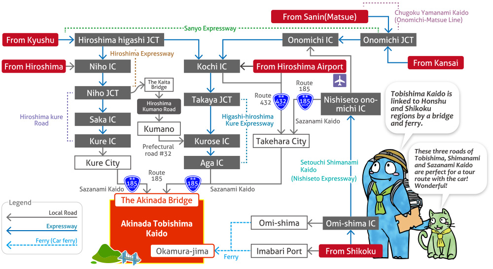 To get to Akinada Tobishima Kaido, leave Hiroshima area via Hiroshima Kure Road (Kurea line). Get on Sanyo Expressway and cross Kyushu, Kansai and Sanin regions. At Takaya Junction get on Higashi-Hiroshima Kure Expressway. Once you reached Takehara area, get on the national highway 185, which is known as Sazanami Kaido. You can also come via Shikoku region (Imabari, Ehime Prefecture) by leading to Setouchi Shimanami Kaido. Once you get in Imabari (Ehime Prefecture), the ferry.