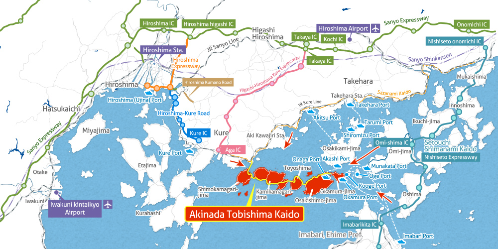 To get to Akinada Tobishima Kaido, leave Hiroshima area via Hiroshima Kure Road (Kurea line). Get on Sanyo Expressway and cross Kyushu, Kansai and Sanin regions. At Takaya Junction get on Higashi-Hiroshima Kure Expressway. Once you reached Takehara area, get on the national highway 185, which is known as Sazanami Kaido. You can also come via Shikoku region (Imabari, Ehime Prefecture) by leading to Setouchi Shimanami Kaido. Once you get in Imabari (Ehime Prefecture), the ferry.