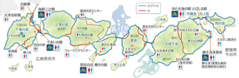 安芸灘とびしま海道サイクリングコースは、アップダウンが少なく、初心者の方でも走りやすいコースです。また、交通量も少なく、信号も見戸代(下蒲刈島)の1箇所しかないので、瀬戸内の多島美と潮風を満喫しながら、爽快なサイクリングが楽しめます。